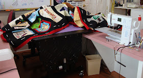 So other than that smack in the face, I have had a really nice day. I figured out a new way to place my quilt top so it isn't like wrestling a grizzly bear in my lap and over my shoulder. Remember that black table I paid $1,000 for at a quilt show? (I just remembered I talked about it on that sewing room video.) Turns out it works really well for this: